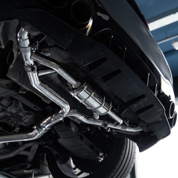 Con questo impianto abbiamo cercato di garantire una prestazione sonora ad una vettura che ha nel suono il suo più grande difetto. Prestazioni di questo livello necessitano di una componente sonora adeguata. Il nostro impianto di scarico catback è completamente realizzato in acciaio inox 309, lucidato a mano, ed è composto da centrale non silenziato, coppia di terminali silenziati e dotati di valvole a comando pneumatico (a depressione).